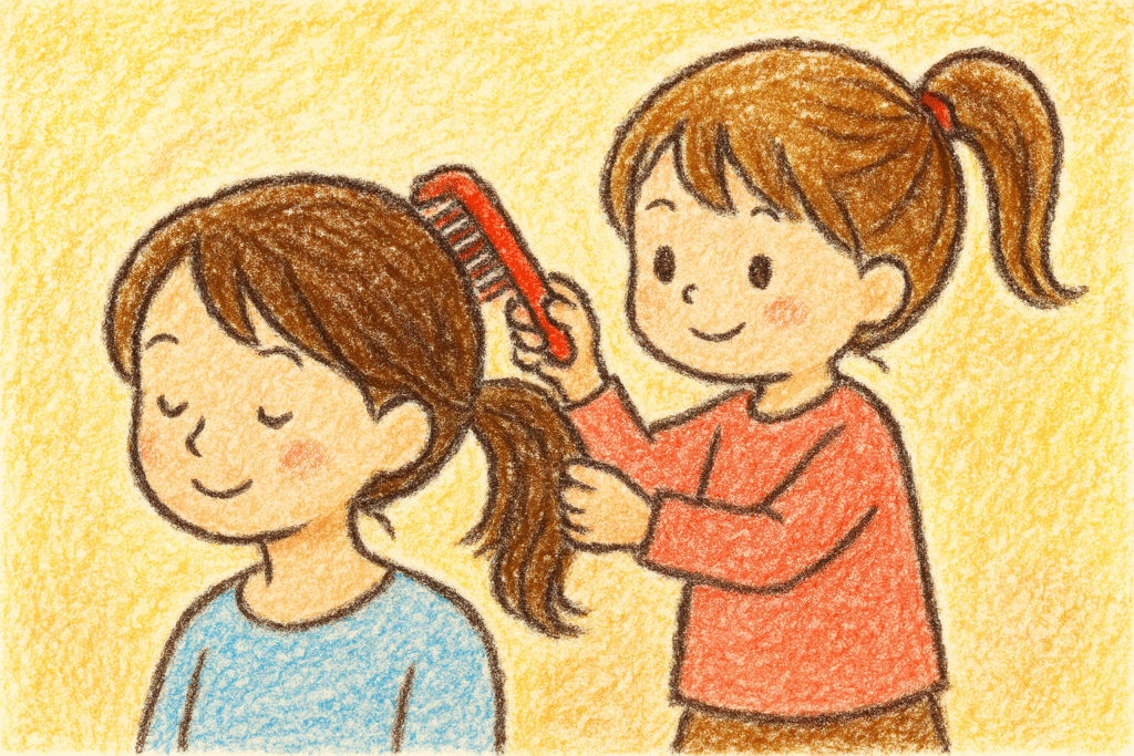ママに教わりながら、ちっちゃな手で一生懸命櫛をといて、