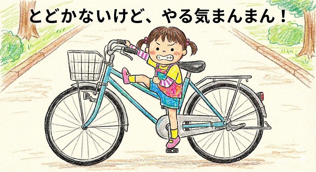 普段なら「やりたい気持ち」を大事にしてあげたいところ。 でも、さすがに交通量の多い道で、足の届かない自転車を運転させるわけにはいきません。これは**「絶対無理」**なやつです。