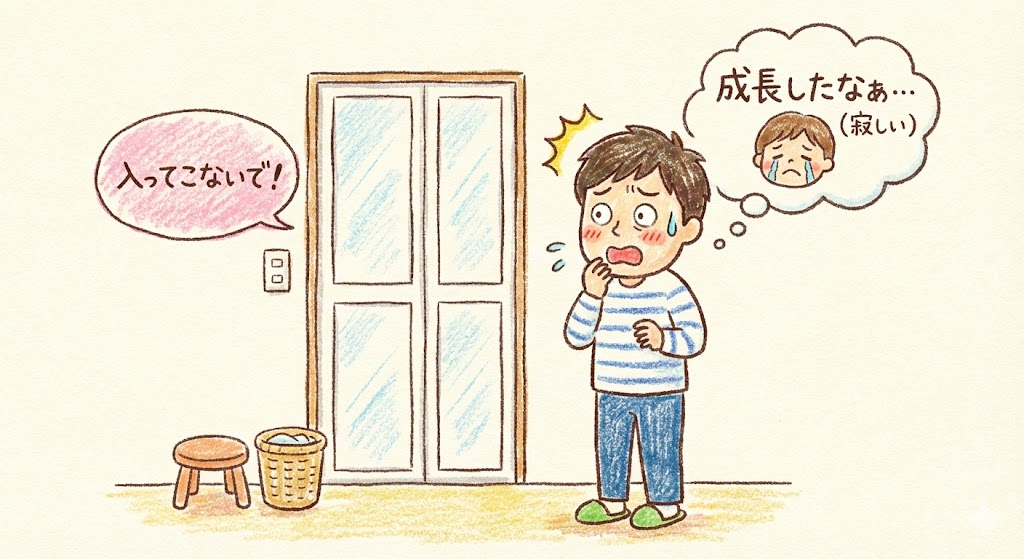 ……えっ!?😱 ドアの向こうから放たれた冷たい一言に、パパは廊下で一人立ち尽くしました……(笑)。 こないだのお出かけで「男子トイレ拒否」された時もショックやったけど、家でもついにこの日が来てしまったんやなぁ。