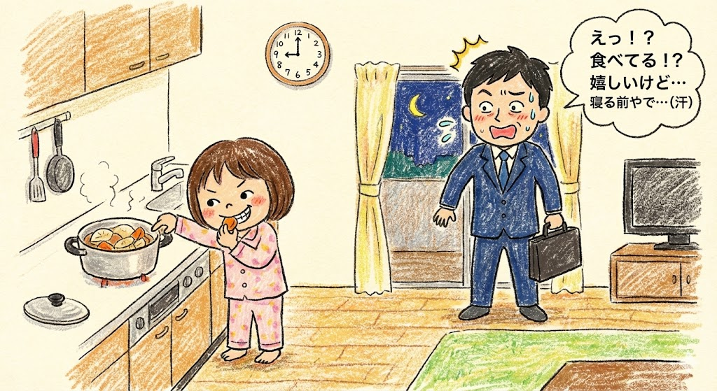 「あーっ! もう寝る前やのにつまみ食いしたらあかんで!」って、親としてはバシッと注意せなあかん場面。 ……やねんけど、パパの心の中はもう大パニックです。