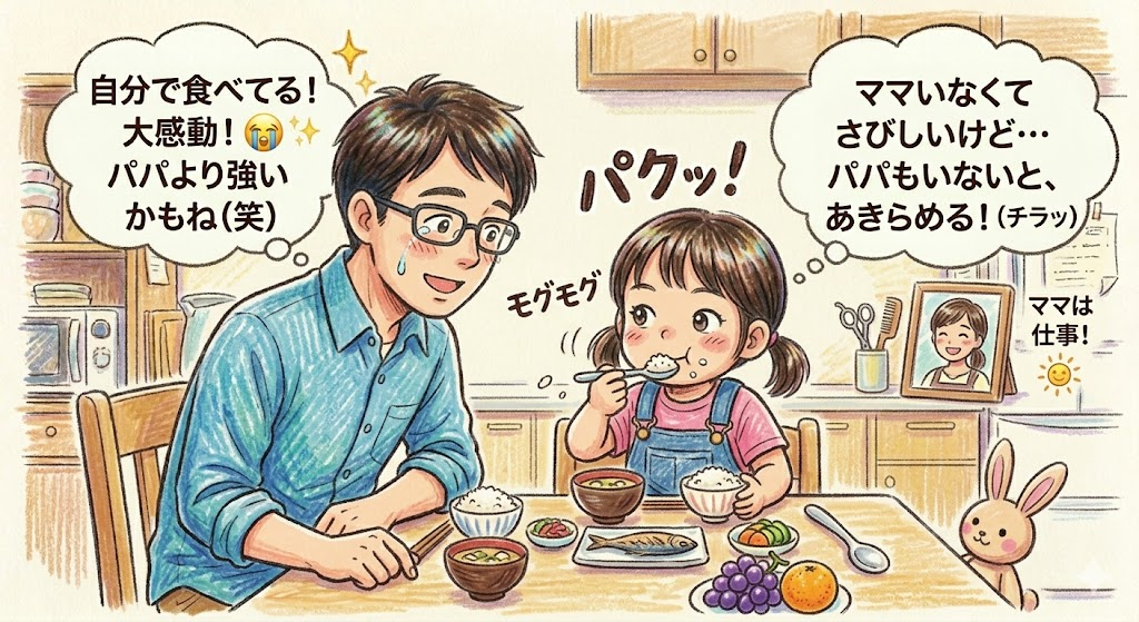 娘は、ママがいないことを悟ったのか、あるいは、パパはママみたいに甘えさせてくれない、と観念したのか……。 パパをチラリと見た後、諦めたように、ゆっくりとスプーンを手に取りました。