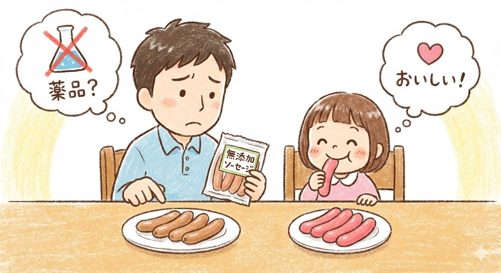 せやから、張り切って**「ナチュラルな無添加ソーセージ」**を買ってきたりするんです! 「これなら安心やし、美味しいで〜!」って食卓に出すんやけど……。