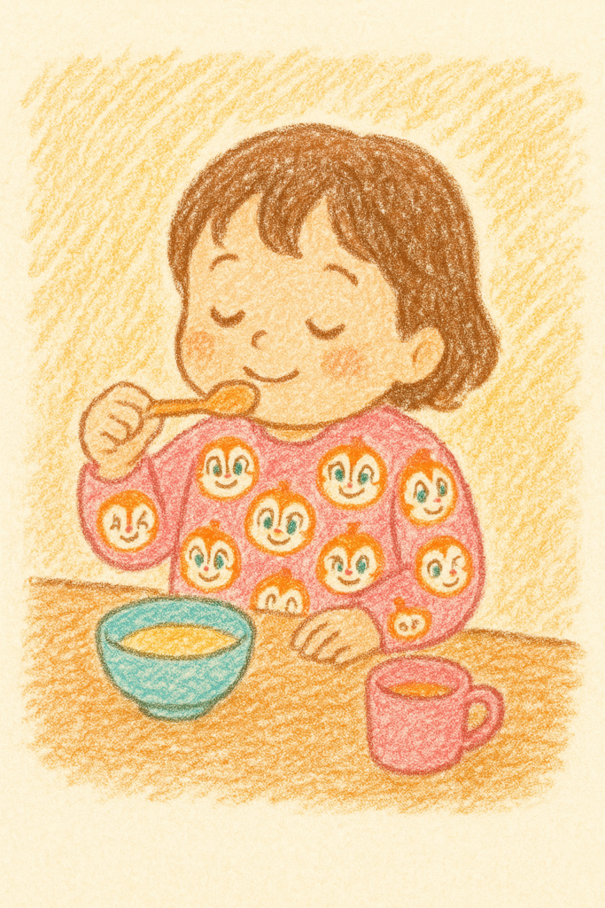 よく見ると、どうやら「せっかくのパジャマを汚さないように」と慎重になっていたようで…その姿がもう可愛くて、ママと一緒にクスッと笑ってしまいました。