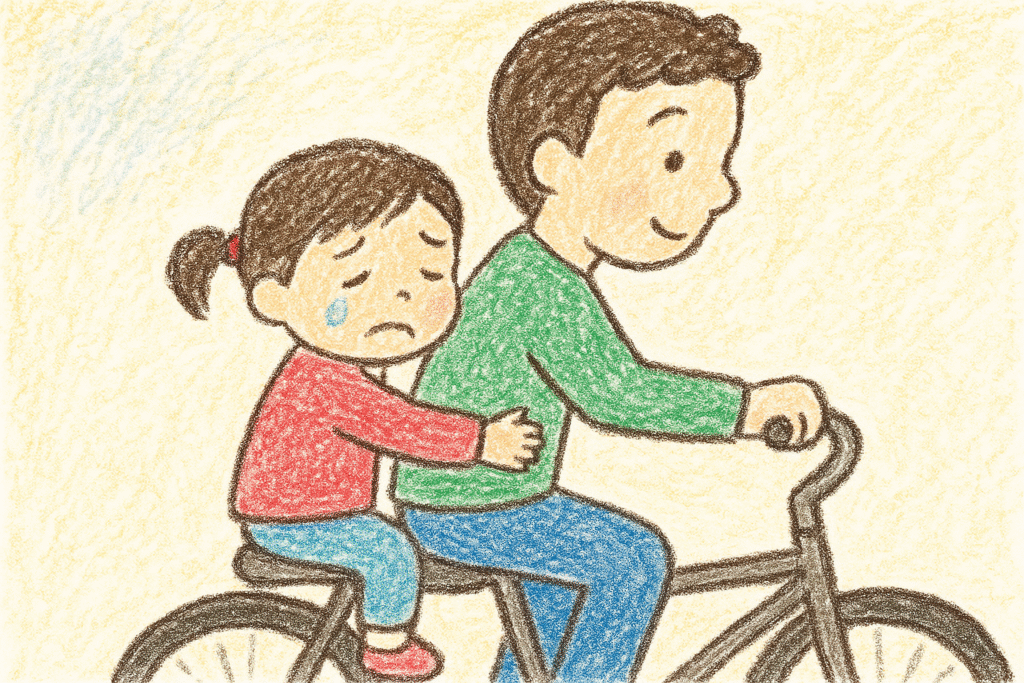 自転車の後ろに乗せると、最初は少しシクシク…。