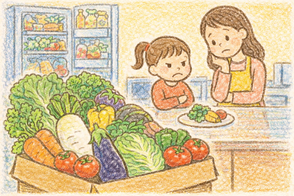 パパの知り合いの農家さんからお願いしていたお野菜に、親戚のおじさんからのとれたて野菜まで重なって、気づけば冷蔵庫がパンパン。入りきらない分は台所の片隅に並べて、ちょっとした直売所みたいになっていました。