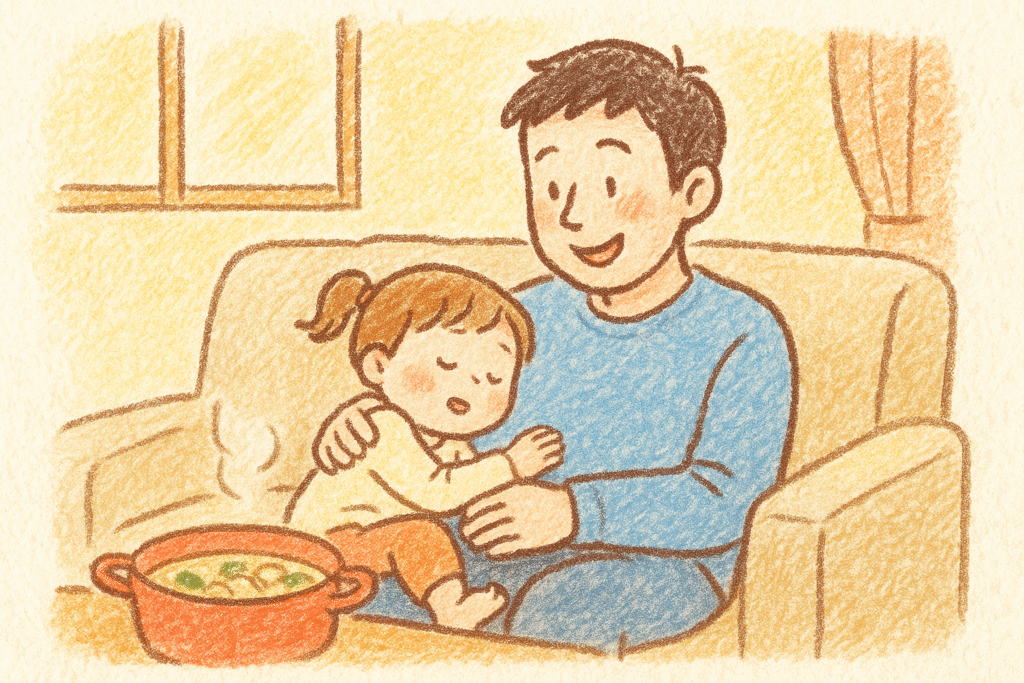 パパは味噌汁の具材をお鍋で温めながらソファに座って待っていたんだけど、